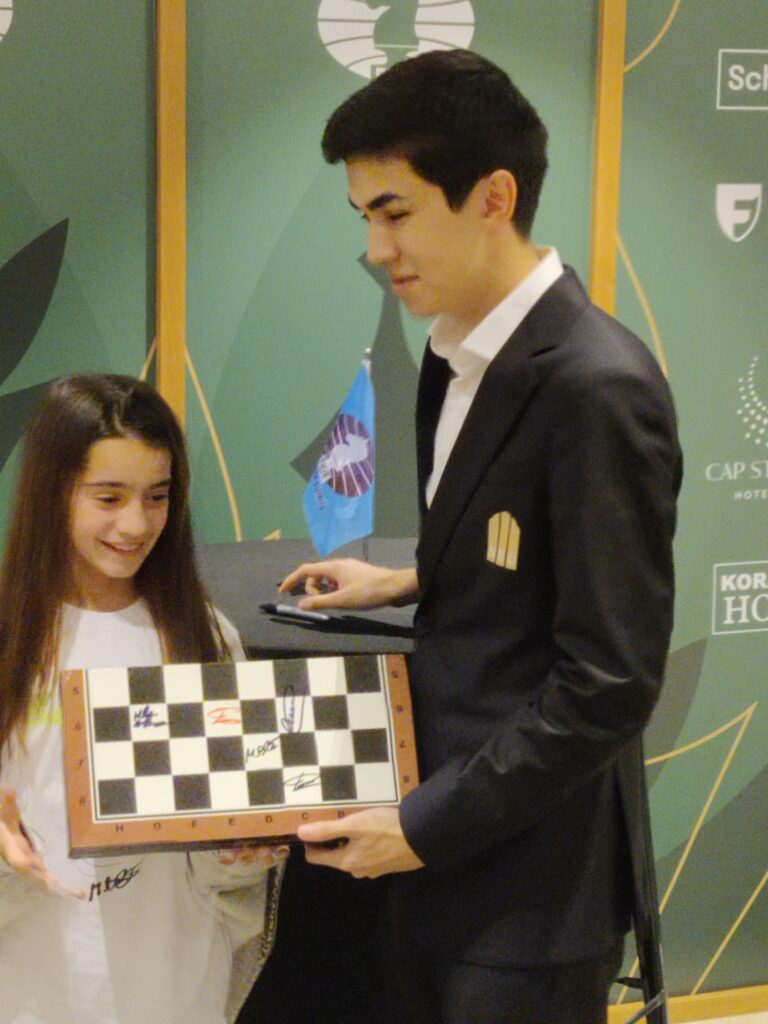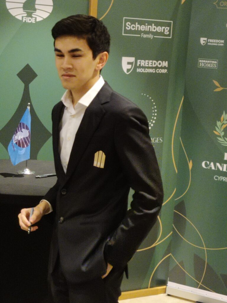 Die Spieler: am auffälligsten der wohl künftige Herausforderer von Weltmeister Gukesh, der 20jährige Usbeke Sindarov. In seinem schwarzen Anzug wirkt er stets wie aus dem Ei gepellt. Er absolviert mit Abstand die meisten Laufeinheiten aller Teilnehmer, tigert oft von einem Ende des Saales zum anderen, ohne die anderen Bretter auch nur eines Blickes zu würdigen. Zeitnot ist für ihn ein Fremdwort. Die Eröffnungen werden stakattoartig aufs Brett getrommelt. Was man sonst nur von Anfängern kennt: vor den meisten Zügen jenseits der Eröffnungsphase kreist die Hand drei-, viermal über der Figur, wird dann immer wieder zurückgezogen, ehe der Zug schließlich ausgeführt wird. Positiv: nach seinem Sieg gegen Prag liess er es sich nicht nehmen, minutenlang geduldig und immer mit einem Lächeln im Gesicht den sehnsüchtig auf ihr Idol wartenden Kindern und auch einigen Erwachsenen für Autogramme und gemeinsame Fotos zur Verfügung zu stehen. Matthias Blübaum kommt unscheinbar und ohne große Gesten rüber, oft muss er aufgrund seiner (relativen) eröffnungstechnischen Limitierung schon nach fünf, sechs Zügen Zeit investieren. In den Pressekonferenzen glänzt er jedoch mit seiner trockenen, selbstironischen Art.
